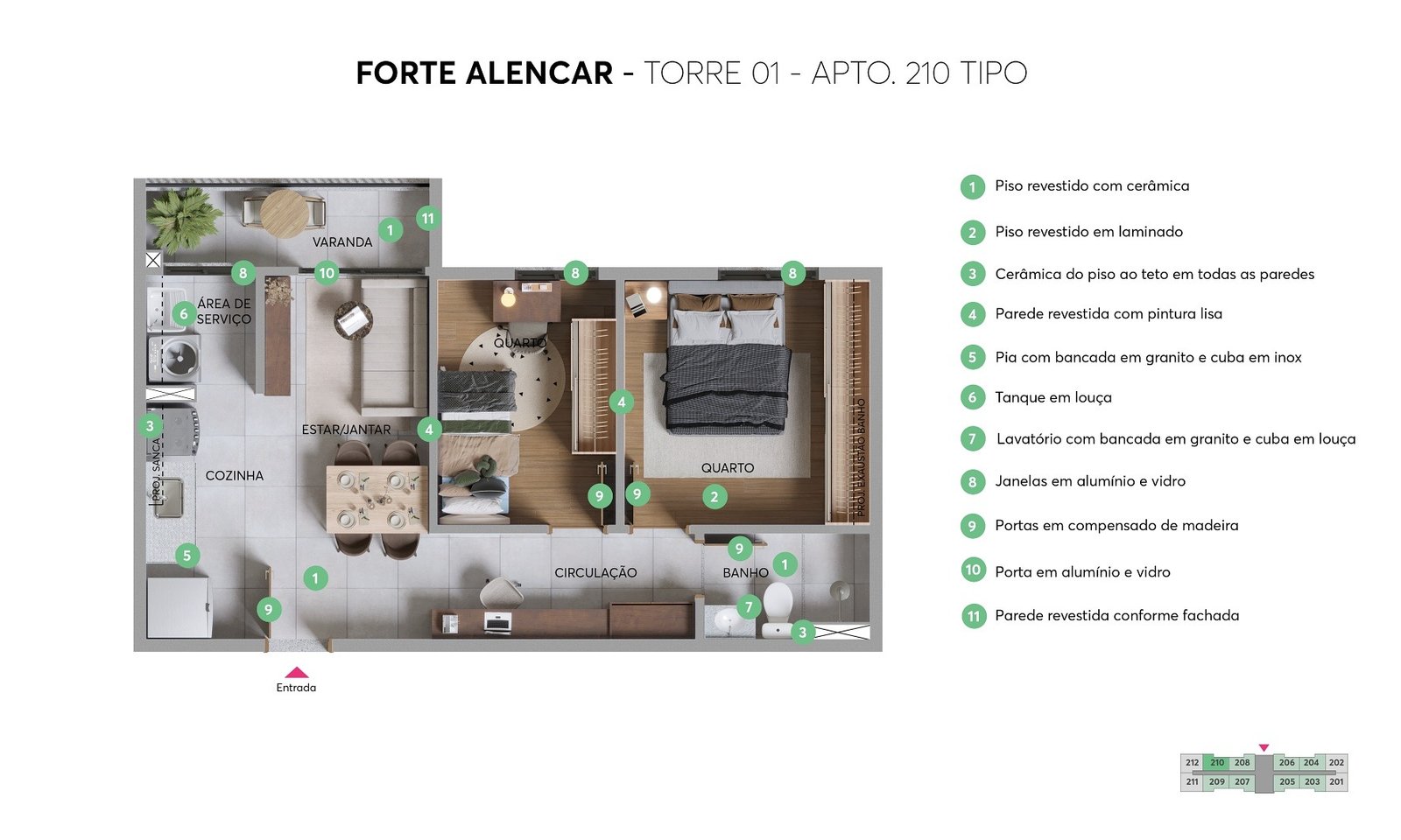 Detalhes que fazem a diferença: cerâmica nas áreas frias, revestimento total nas áreas molhadas, previsão para ar-condicionado, medição de água individualizada e economizadores de água e energia .