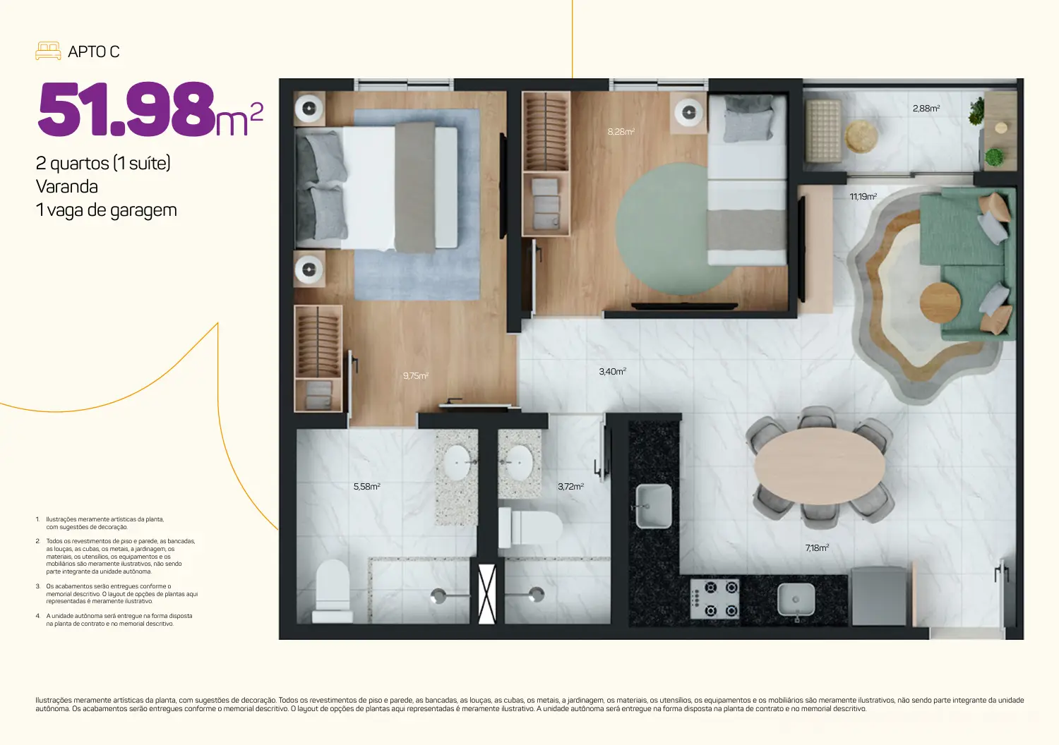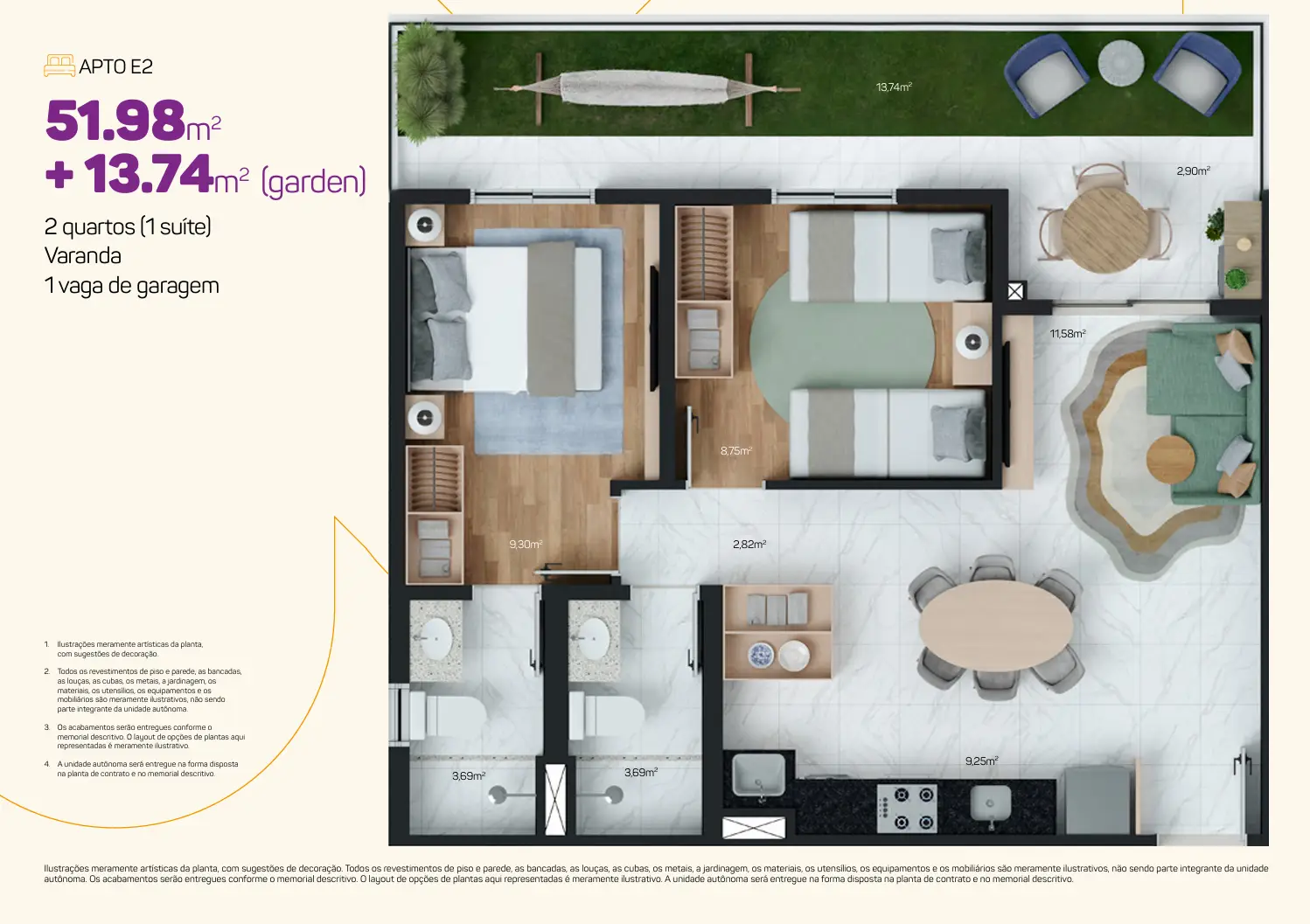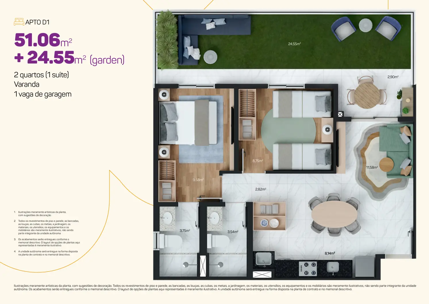 As unidades têm de 51 m² a 76 m², todas com 2 quartos, sendo 1 suíte, varanda e opção de garden.