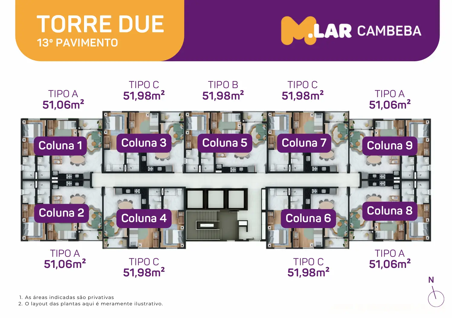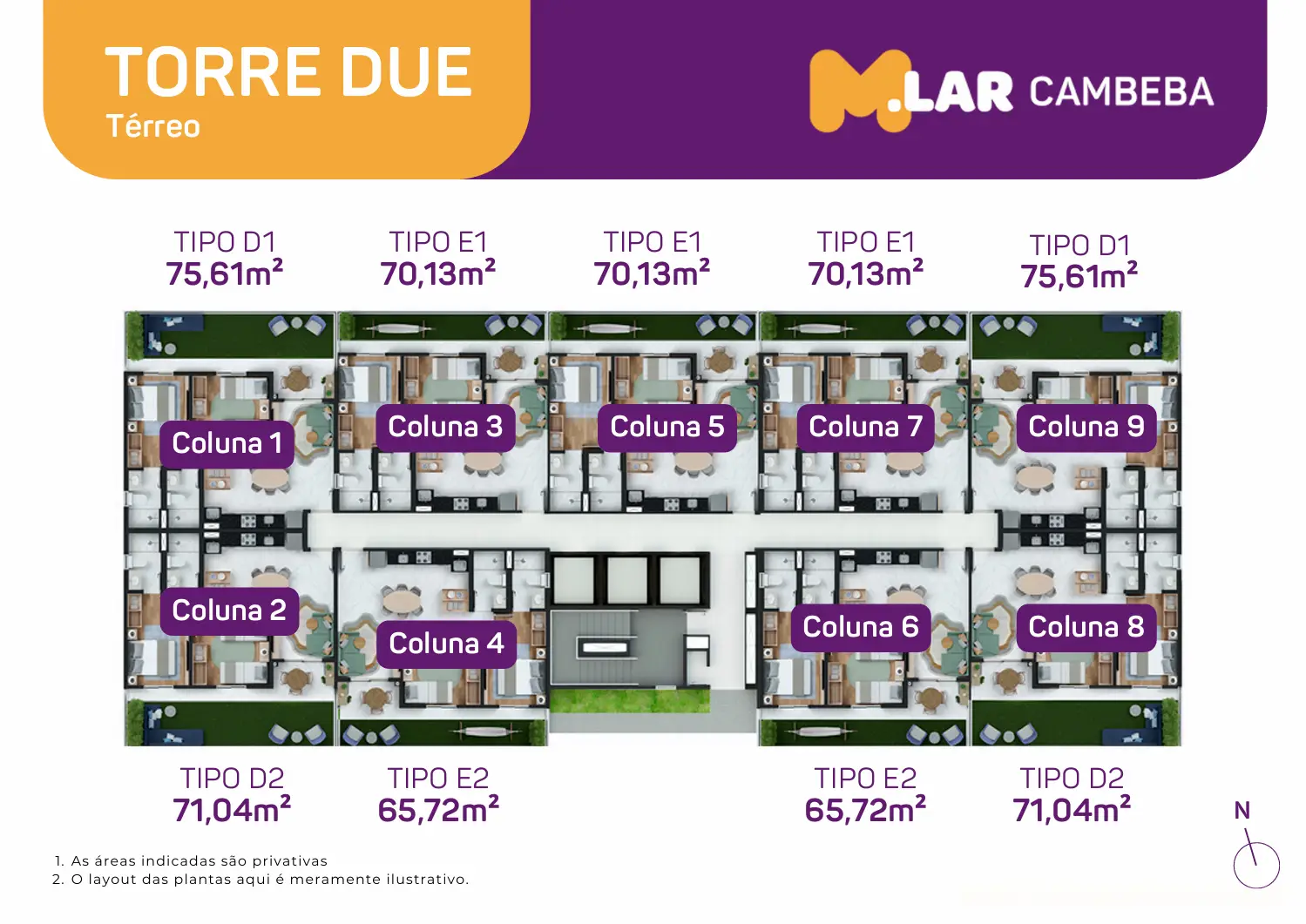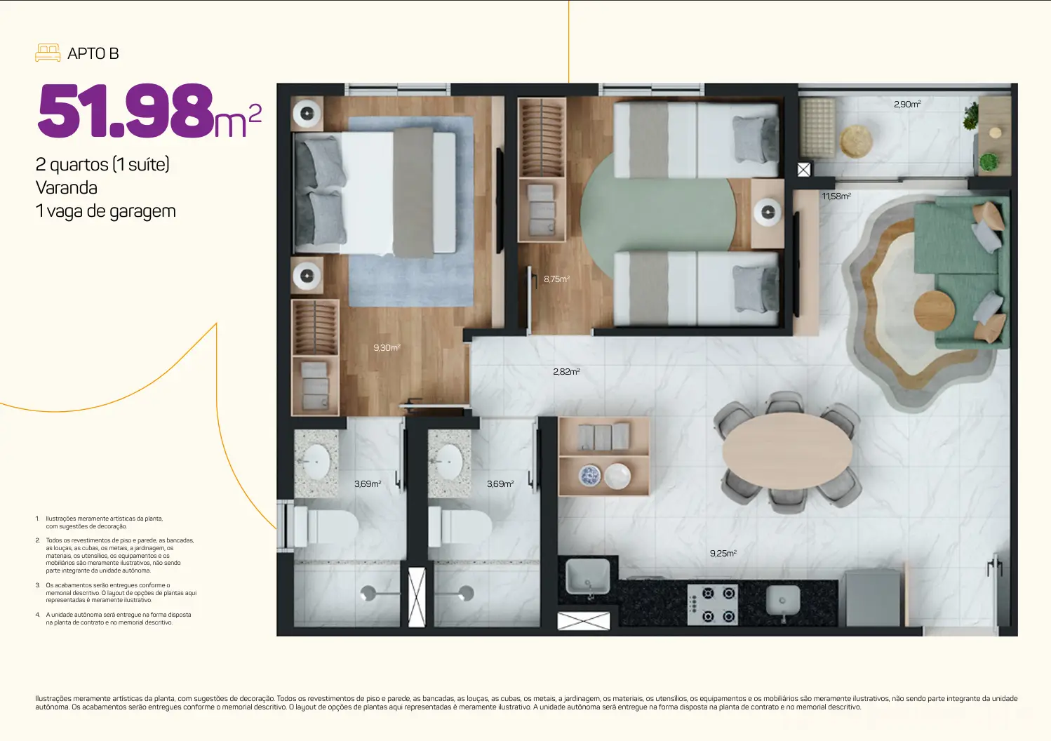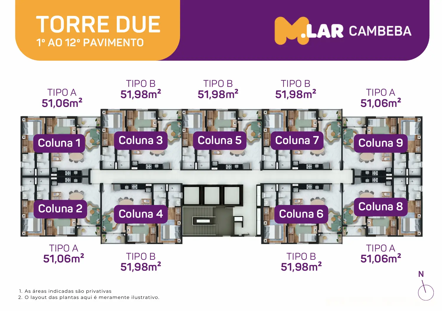 As unidades têm de 51 m² a 76 m², todas com 2 quartos, sendo 1 suíte, varanda e opção de garden.